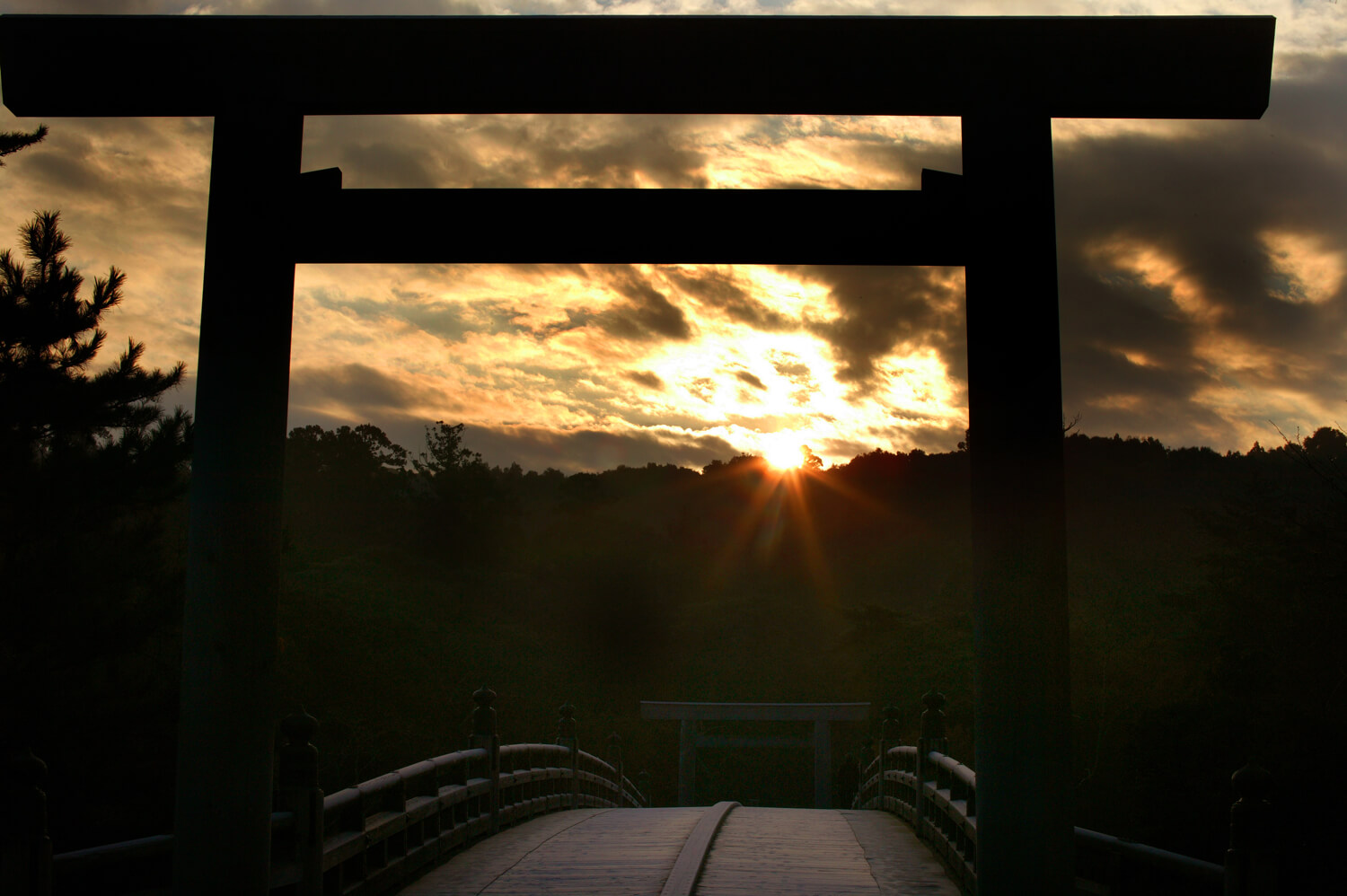 The grand torii of Ise Jingu bathed in the rays of the early morning sun.