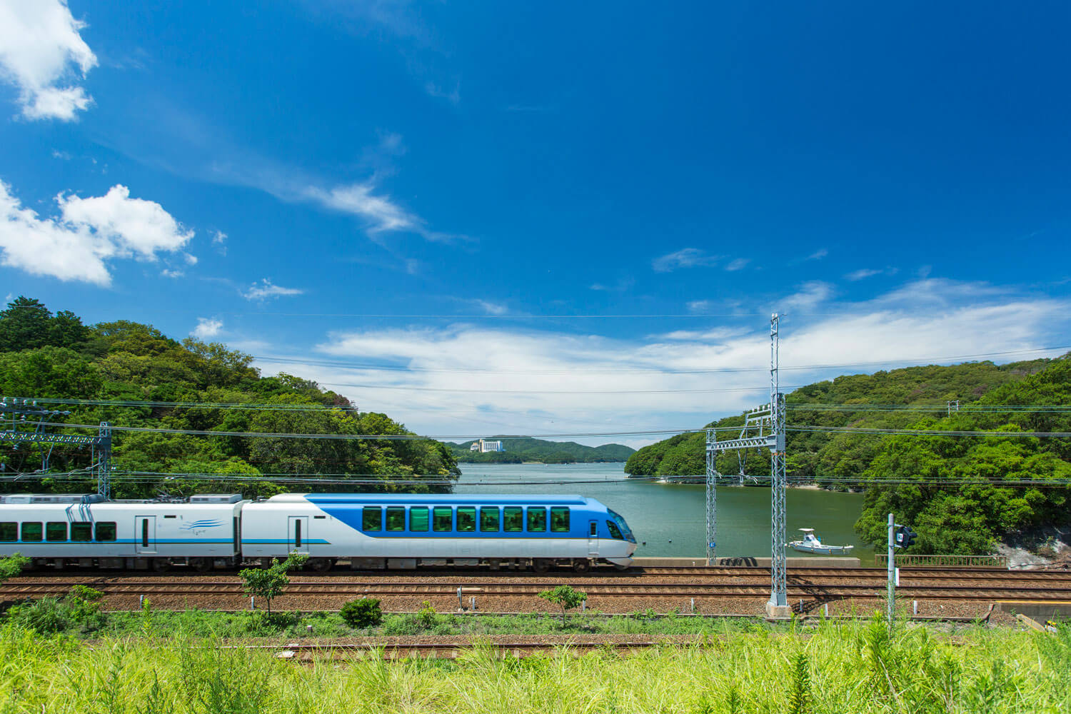 The blue train cars were designed in the image of the bracing wind that gusts through Ise-Shima, and the beautiful sky. The train cuts a vivid form as it races through the abundant nature.
