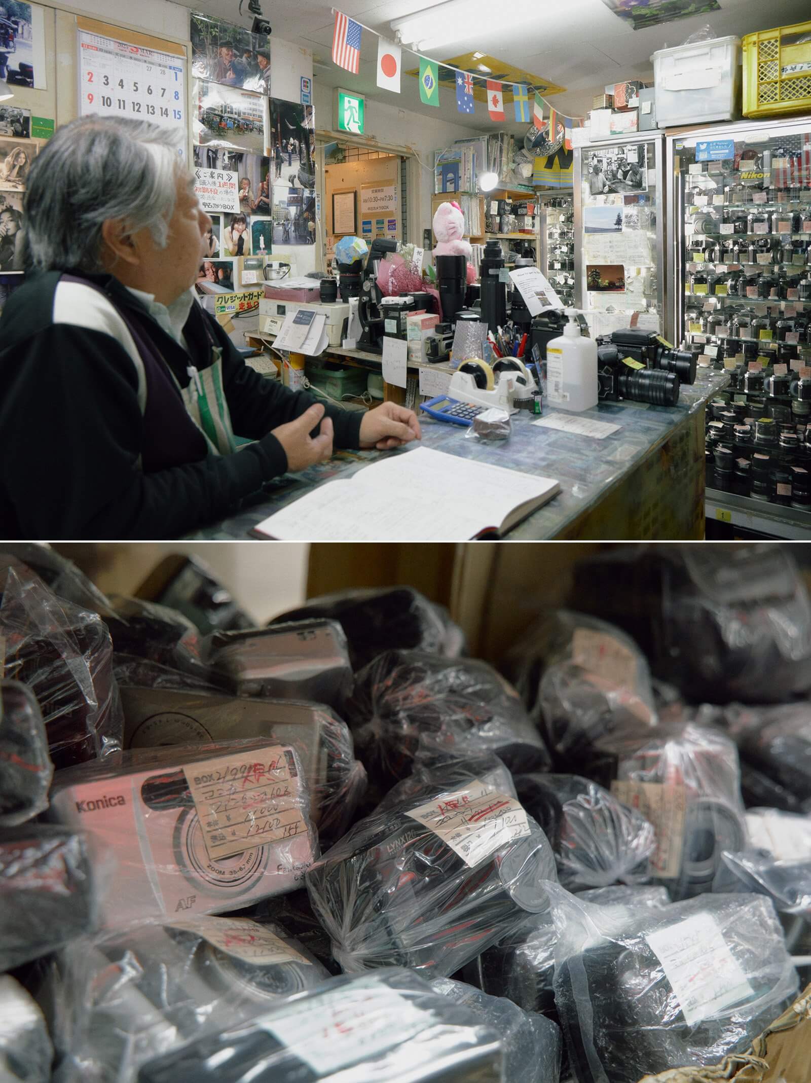 Top: ‘Today, about 70 to 80% of our customers are foreigners,’ says manager Furuo Tanaka. Warm and welcoming, he always greets tourists with a smile as they capture memories with a souvenir photo. Most of the buyer information in his notebook is also written in the Latin alphabet. Bottom: This area truly feels like a treasure hunt. When unsure, customers can easily take cameras out of their cases to inspect them. With such a large stock, multiple copies of the same model are often available, allowing for price and condition comparisons.