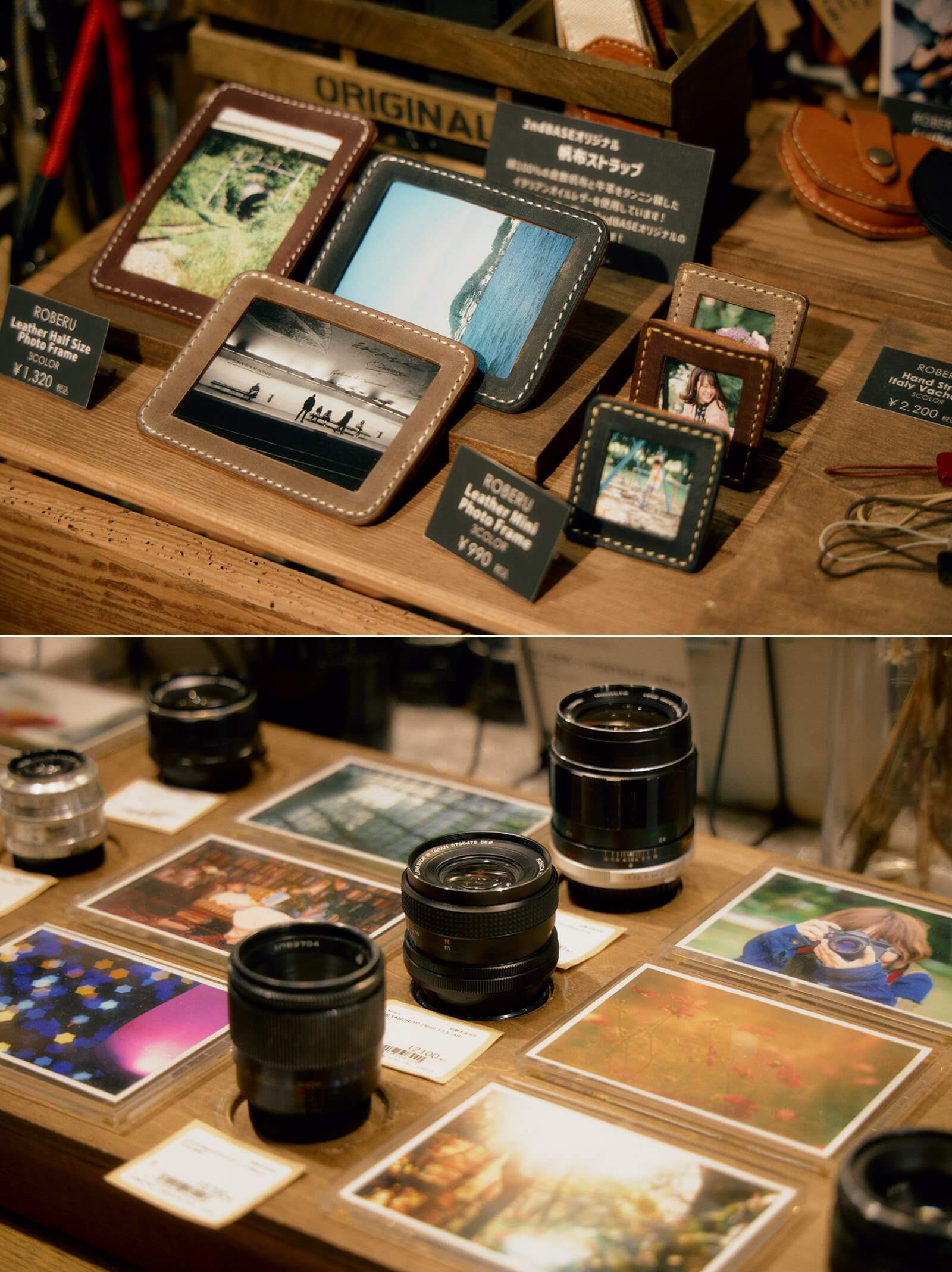 Top: In the accessories corner, there’s also a line of leather goods designed by Yūta Mimura himself, who admits to loving cameras as objects. Bottom: Next to the vintage lenses for sale, photos taken with each lens are displayed. Various mount adapters are available, allowing customers to test lenses on their own cameras before buying.