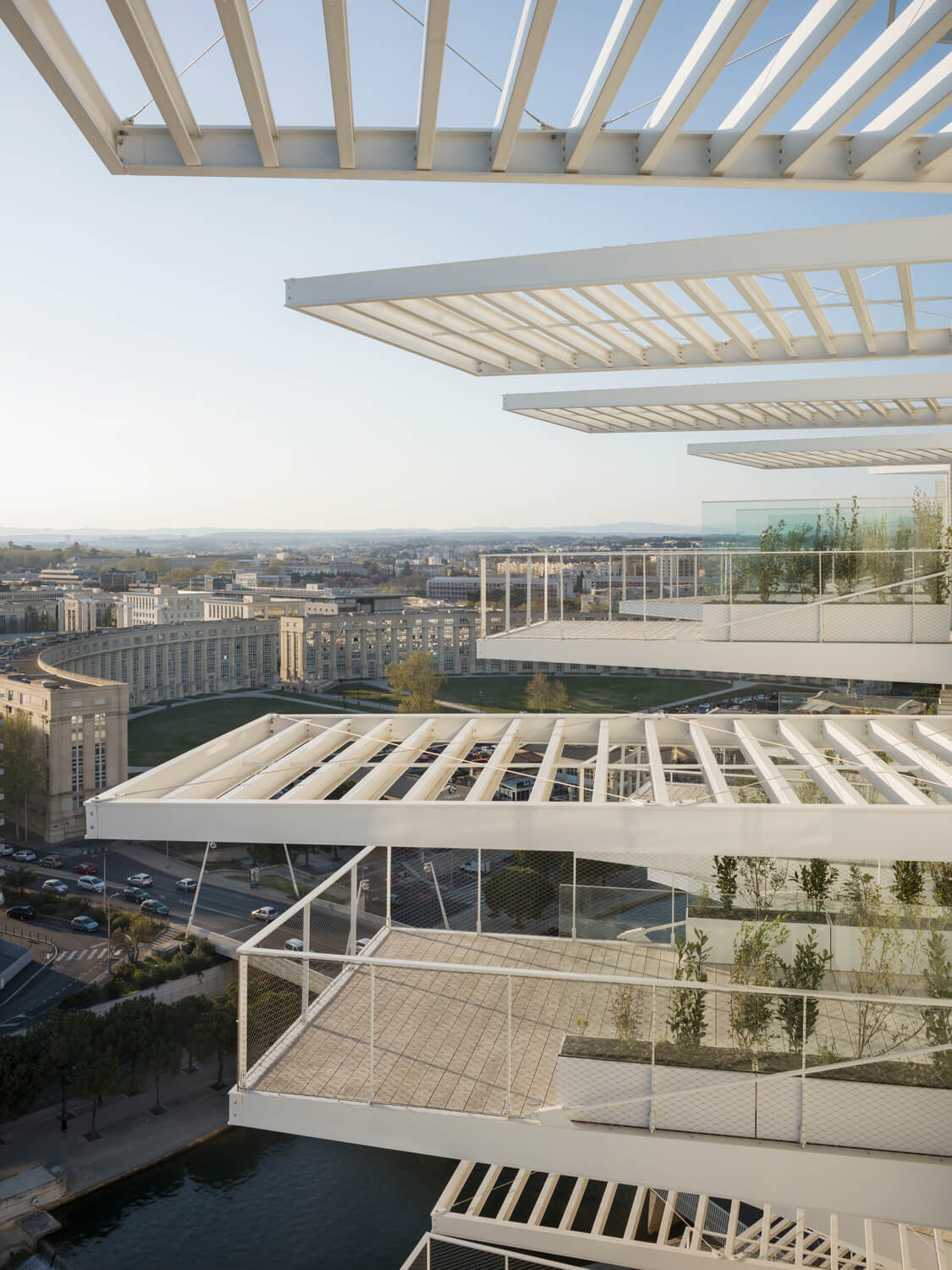 At 56 metres tall, the tower block has 17 floors and 113 apartments, offering residents exceptional views across the Mediterranean and the Pic Saint-Loup with its rooftop bar, which opened at the end of May 2019. At the foot of the building, both residents and tourists can dine at the restaurant on the banks of the Lez.