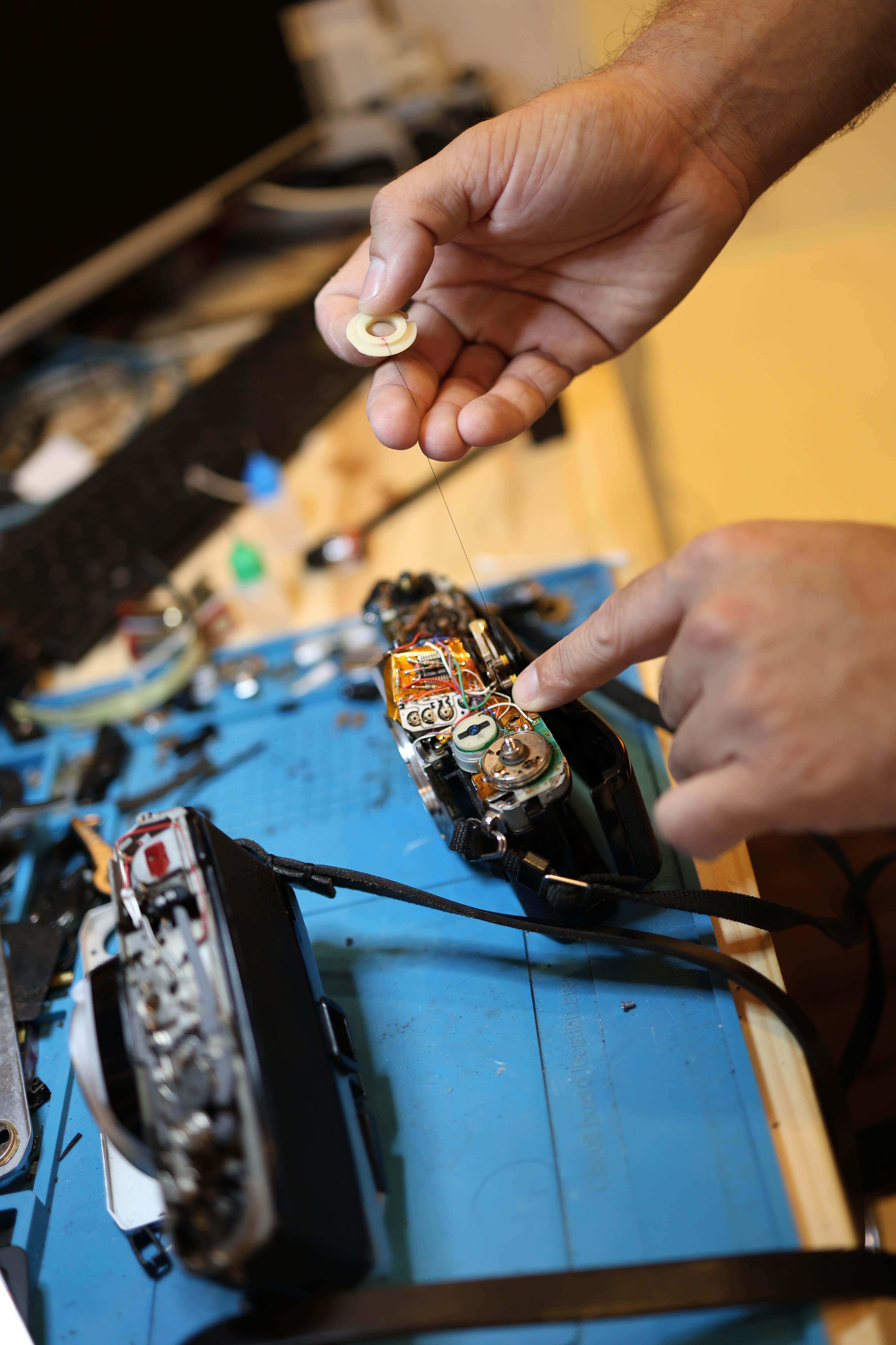 Clément Lacombe in the process of repairing a camera. © Rebecca Zissmann
