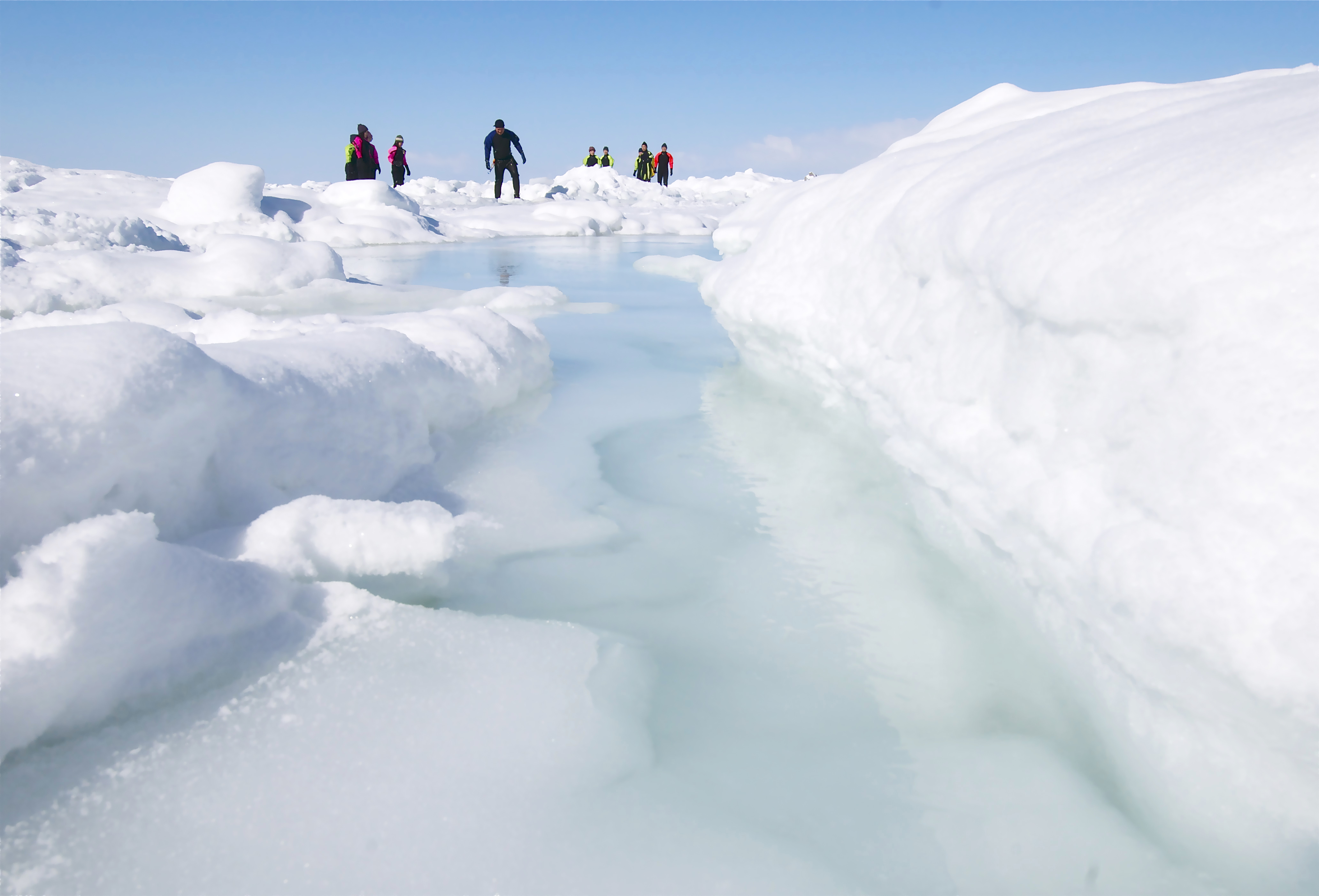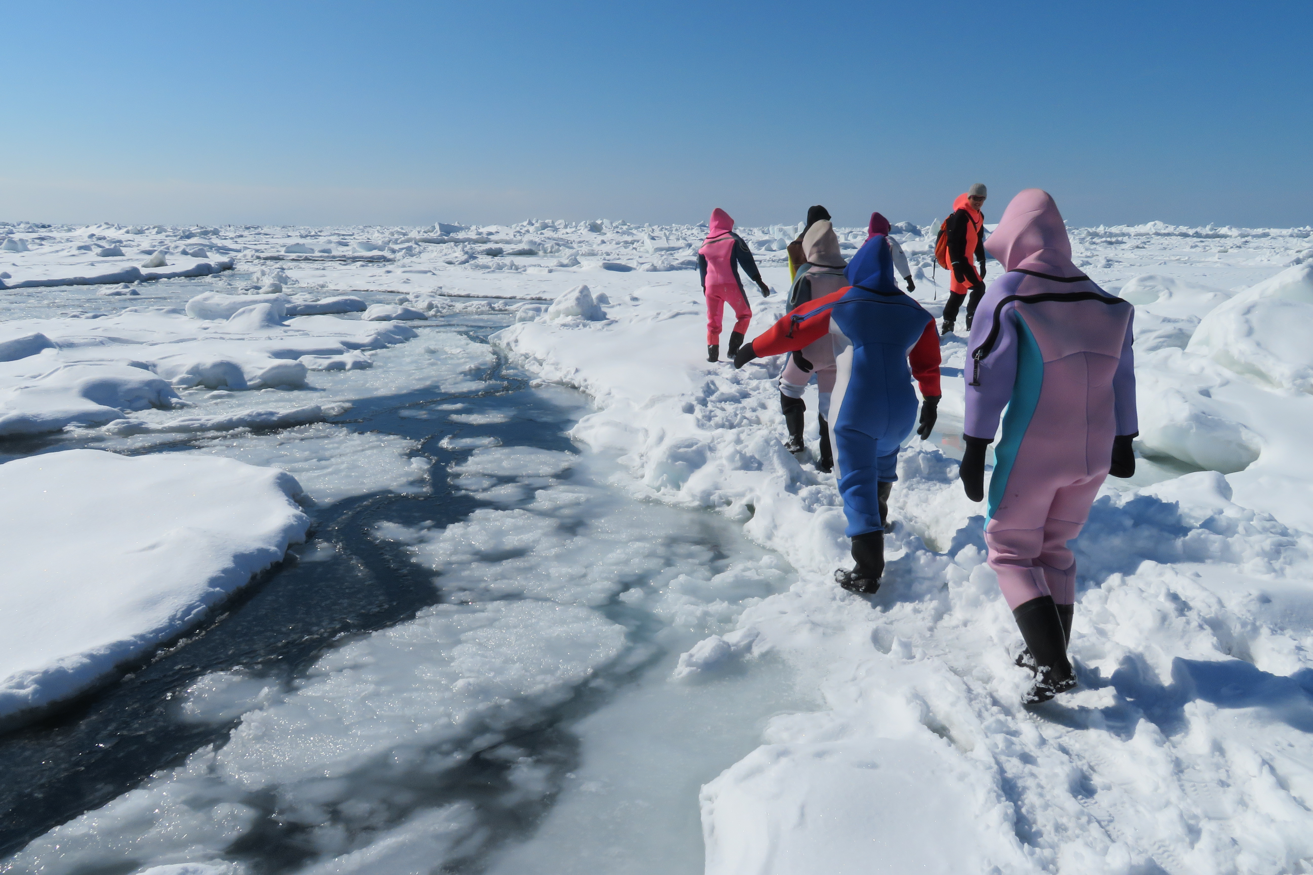 Each winter, water from the Amur River in Russia freezes as it flows into the Sea of Okhotsk, creating blocks of ice that are carried along by currents to the northeastern coast of Hokkaido—a phenomenon known as drift ice. Once this ice has fully solidified, intrepid travellers don dry suits and embark on walking tours across the frozen stepping stones.