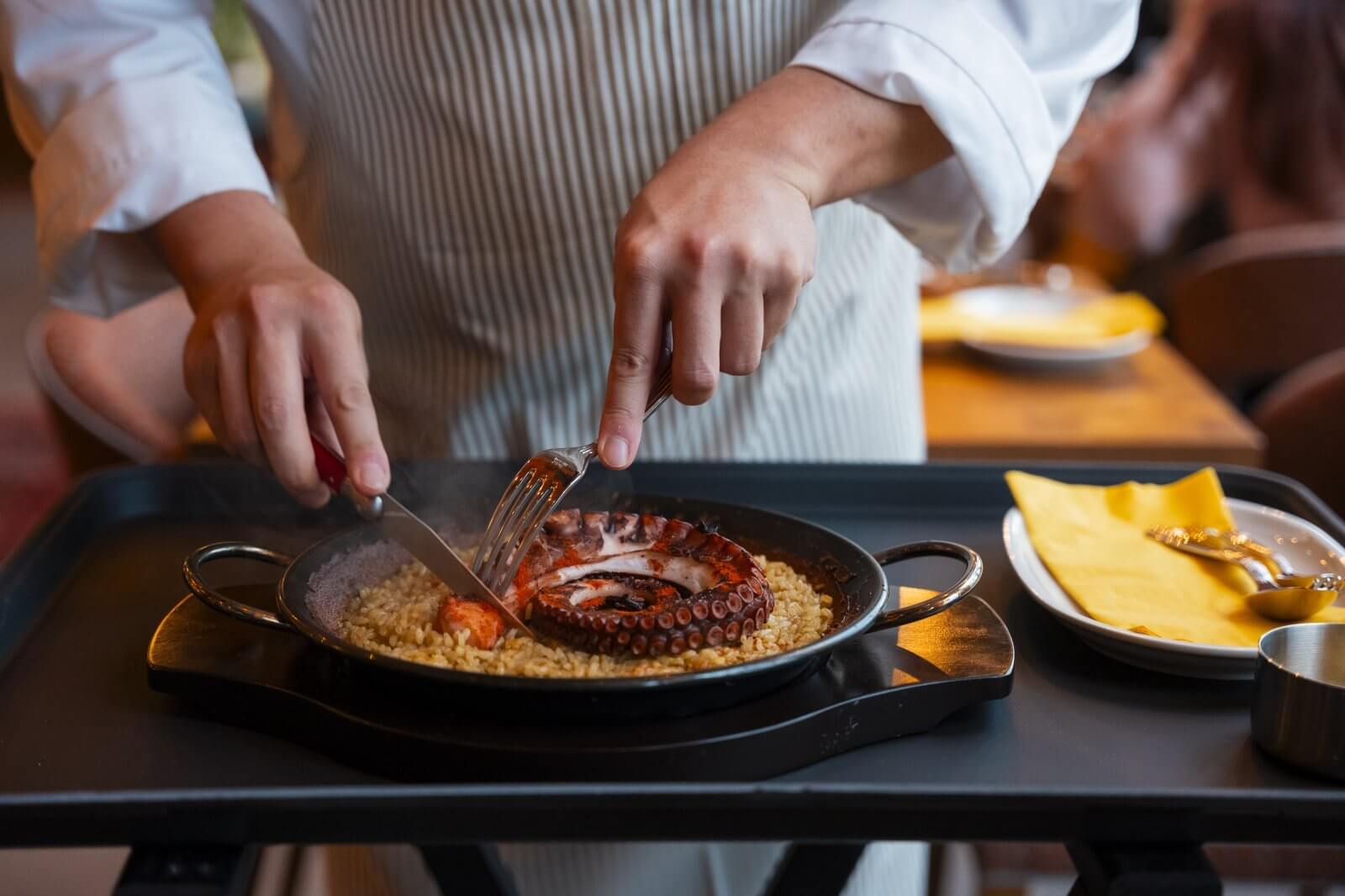 The restaurant’s signature dish, ‘Island Octopus and Zarzuela Paella with Island Garlic Aioli,’ features an entire leg of locally sourced octopus. The aioli is mixed in front of guests in a theatrical performance. Grilled in a Josper charcoal oven, the octopus is crisp on the outside, tender and juicy inside, delivering a remarkable burst of flavor.