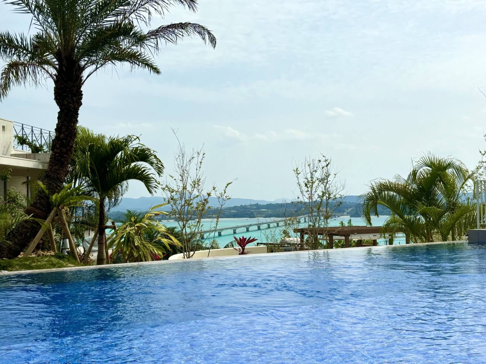 The infinity pool seems to merge with the emerald sea, offering a view of the Kouri Bridge, praised as a ‘beautiful bridge.’