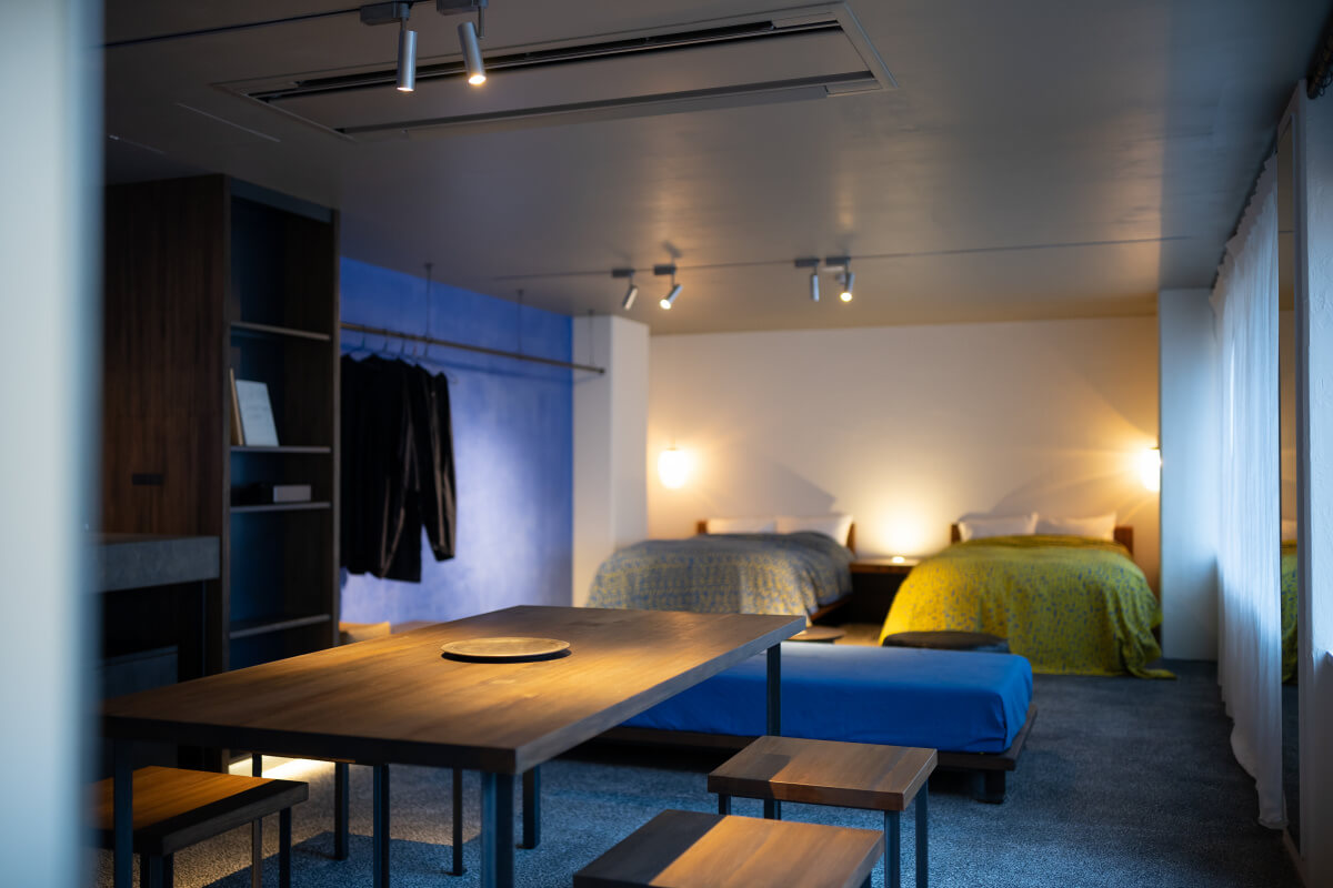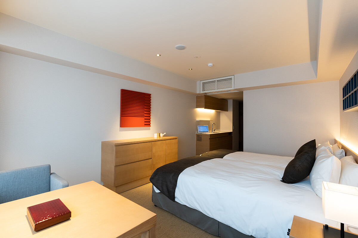 Room with bunkrooms for 1-2 guests, ¥14,000 and up. Room with queen-sized bed for 1-2 guests, ¥22,000 and up. Room with king-sized bed for 1-2 guests, ¥22,500 and up. Room with superior queen-sized bed for 1-2 guests, ¥23,000 and up. Room with superior king-sized bed for 1-2 guests, ¥23,500 and up. Room with superior twin beds for 1-3 guests ¥26,500 and up. Room with Enso twin beds for 1-3 guests, ¥29,500 and up. Room with Enso twin beds and kitchen for 1-3 guests, ¥31,500 and up. (All prices include tax and service charges). ※Note that different buildings have different types of rooms.