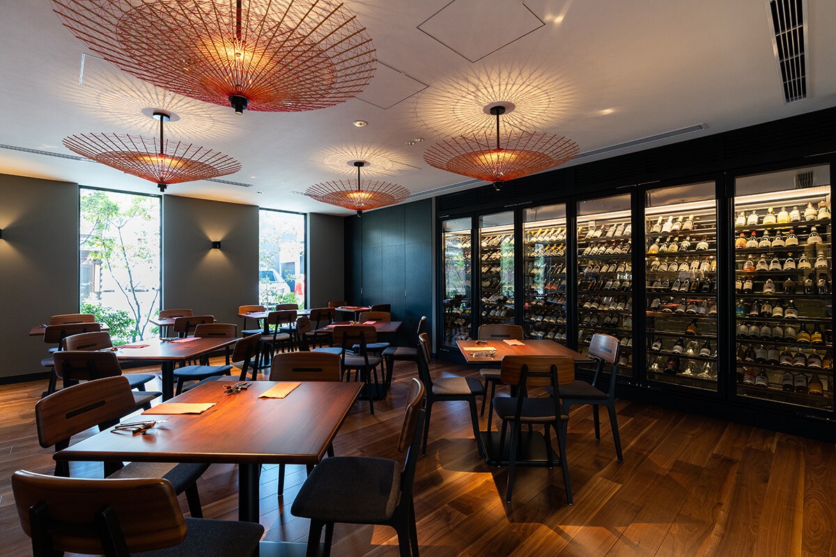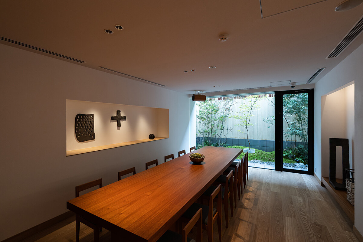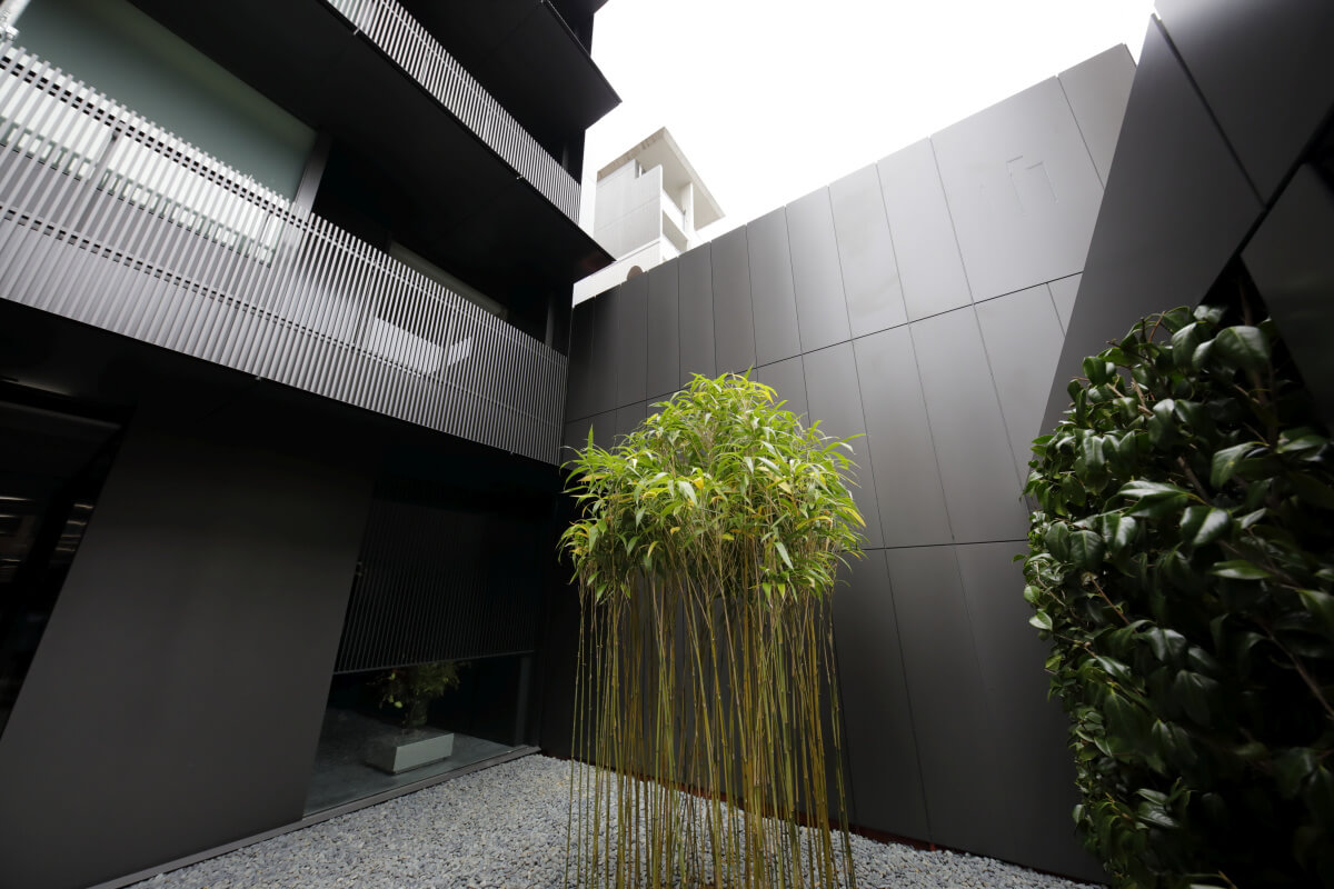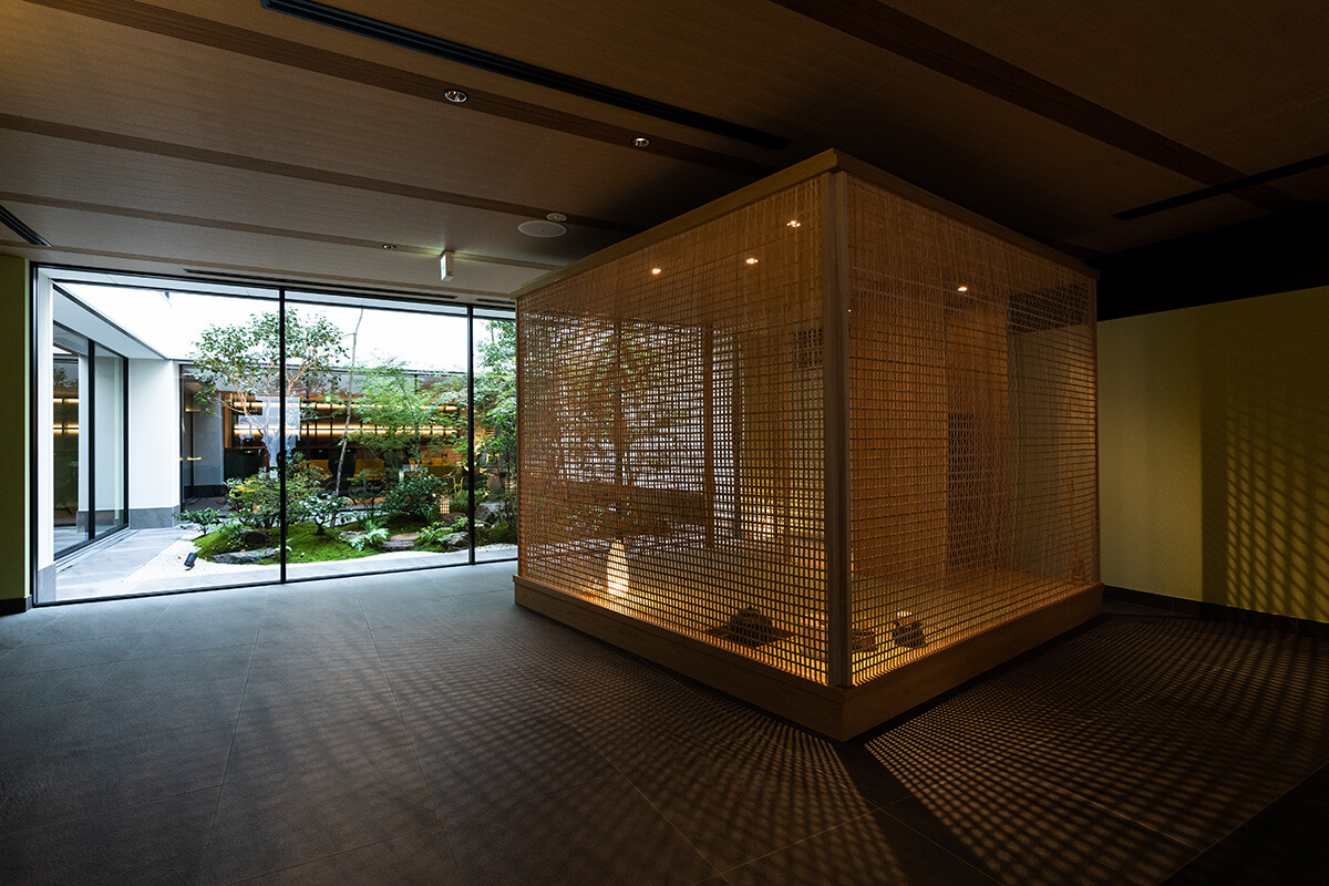 The structure is the work of Kyoto-born architect Takashi Yamaguchi. The long hallway that optimizes the narrow ‘eel burrow’ layout has a stainless steel floor resembling tatami (straw mats) and latticework on the ceiling and walls. Kyoto’s traditional architectural forms have been reconstructed with a modern touch, such as the tsuboniwa (compact courtyard gardens) integrated with the natural world, and the stereoscopic finish on the perpendicular walls of the atrium.