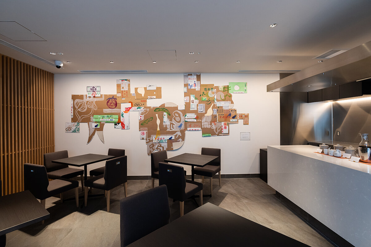 Overall direction is in the hands of Uchida Design Inc., founded by the late interior designer Shigeru Uchida, with participation of artists and architects Masanobu Ando, Naoki Terada, Katsuhiko Hibino, and Atelier Oi. Each assigned to one of the five buildings, of varying scales, hotels packed with unique art and designs were completed. The guest rooms, a total of 229 spread over five hotels, come in a variety of styles, from twin beds plus kitchen, to bunkrooms with two stacked beds. Facilities such as restaurants, bars, and gyms are dispersed throughout the buildings, which are all freely accessible to the guests, who enjoy their sojourn while naturally blending into the neighborhoods. The program of cultural exchange, which would intrigue even Kyoto regulars, includes night runs through the streets of Kyoto, and zazen meditation sessions held in the tatami room, led by the vice-abbot of Ryosoku-in Temple within the Kennin-ji complex.