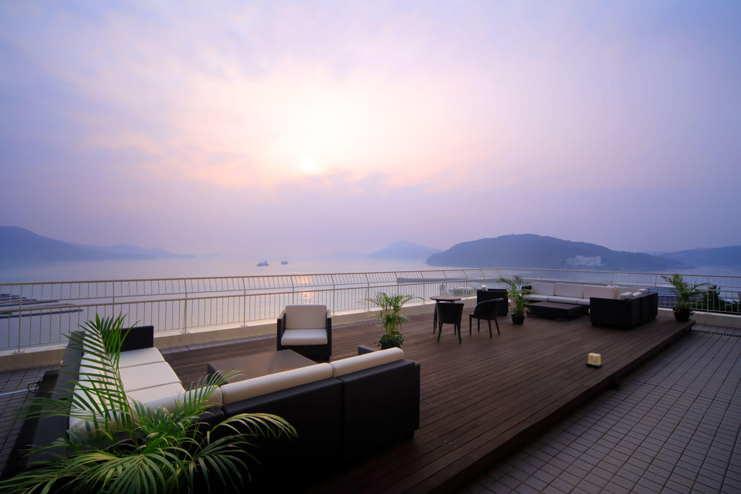 The terrace space is directly connected to the lobby. Guests can sit on sofas on the wooden deck as they enjoy the scenery of the wind and birds traversing the sea.