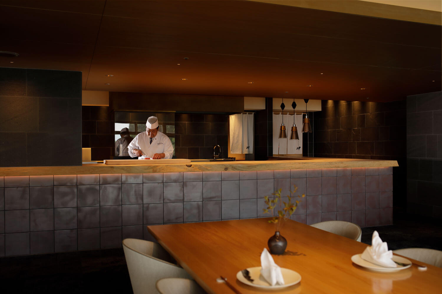 View of the Chef’s Kitchen inside the Japanese restaurant Mondo Misaki. The counter, imparting an air of dignified solidity, is made from a single piece of wood cut from a three-century-old Japanese hinoki cypress tree from Mie. One element of the restaurant’s fascination is the ability to watch the chefs preparing the food right in front of you.