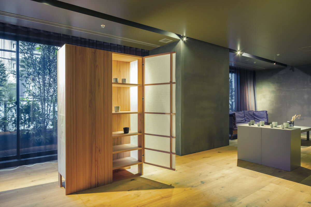For example, the cabinets that give an overwhelming sense of presence throughout the guest room were produced through collaboration between De Intuïtiefabriek, a design unit in Amsterdam, and Soma, a brand of products using coniferous wood sourced domestically from Gifu Prefecture. A team from De Intuïtiefabriek visited the Soma atelier in Gifu, and began designing the objects from the conceptual stage there, highlighting the contrast between the strength of Japanese cedar wood with its annual rings and straight grain, and the softness of Gifu washi paper, produced locally, which covers half of the cabinets.