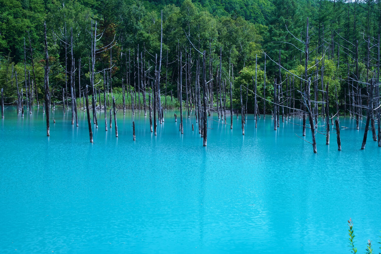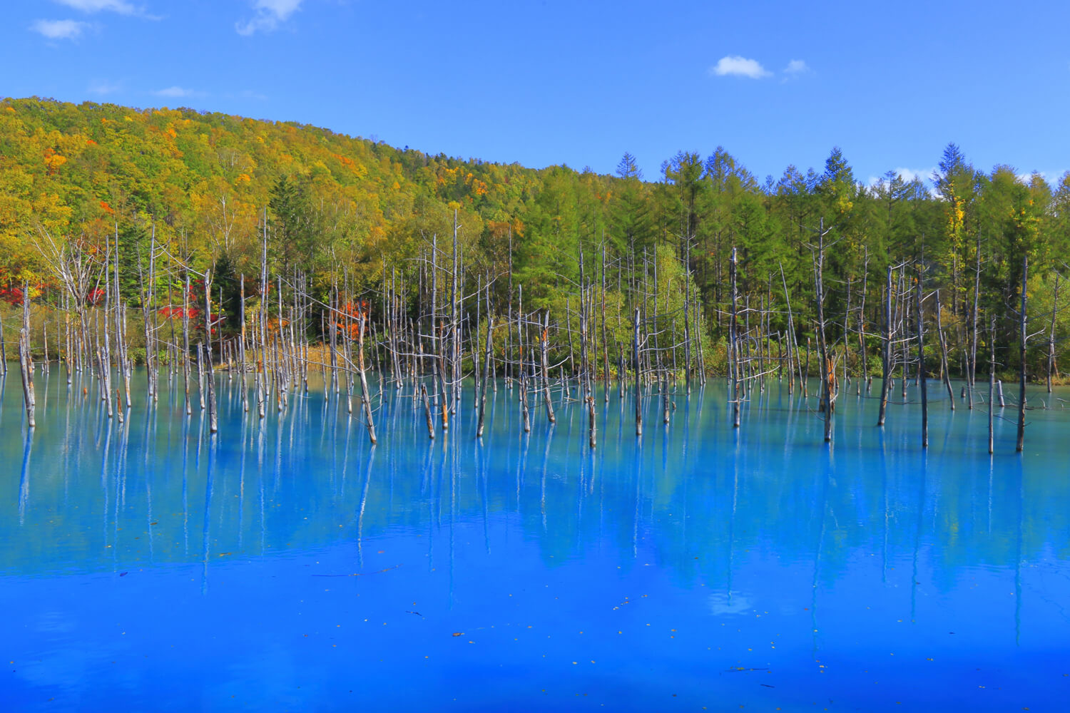 The water in the Blue Pond, located in the town of Biei in Hokkaido, takes on different shades depending on the season.