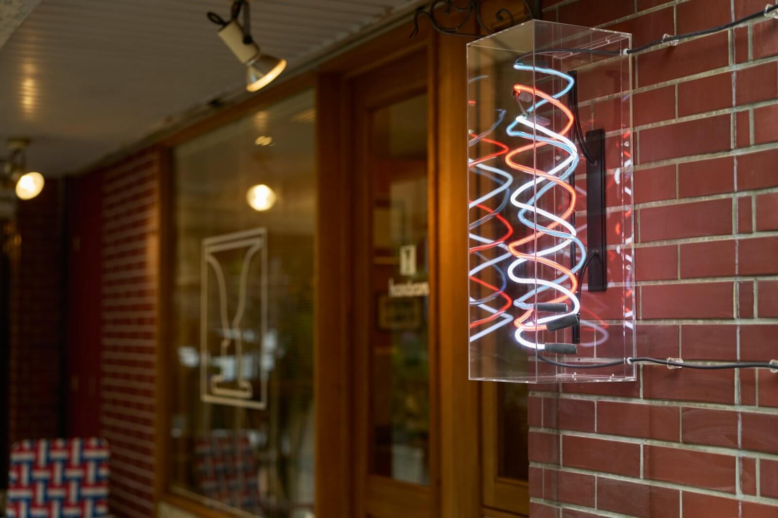 A one-of-a-kind neon sign by artist WAKU brings an unmistakable barbershop presence.