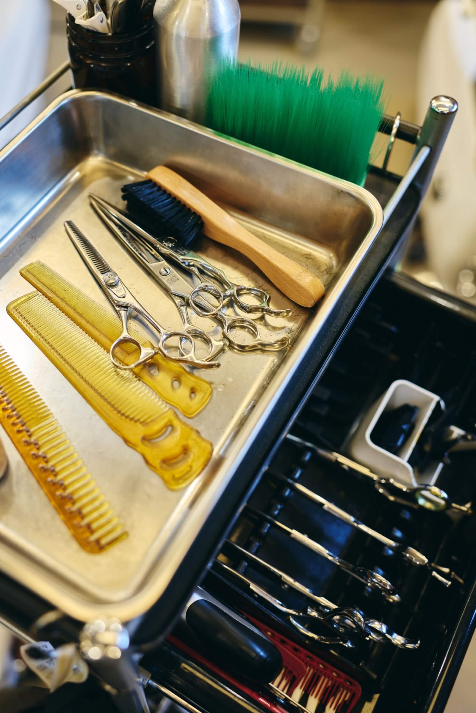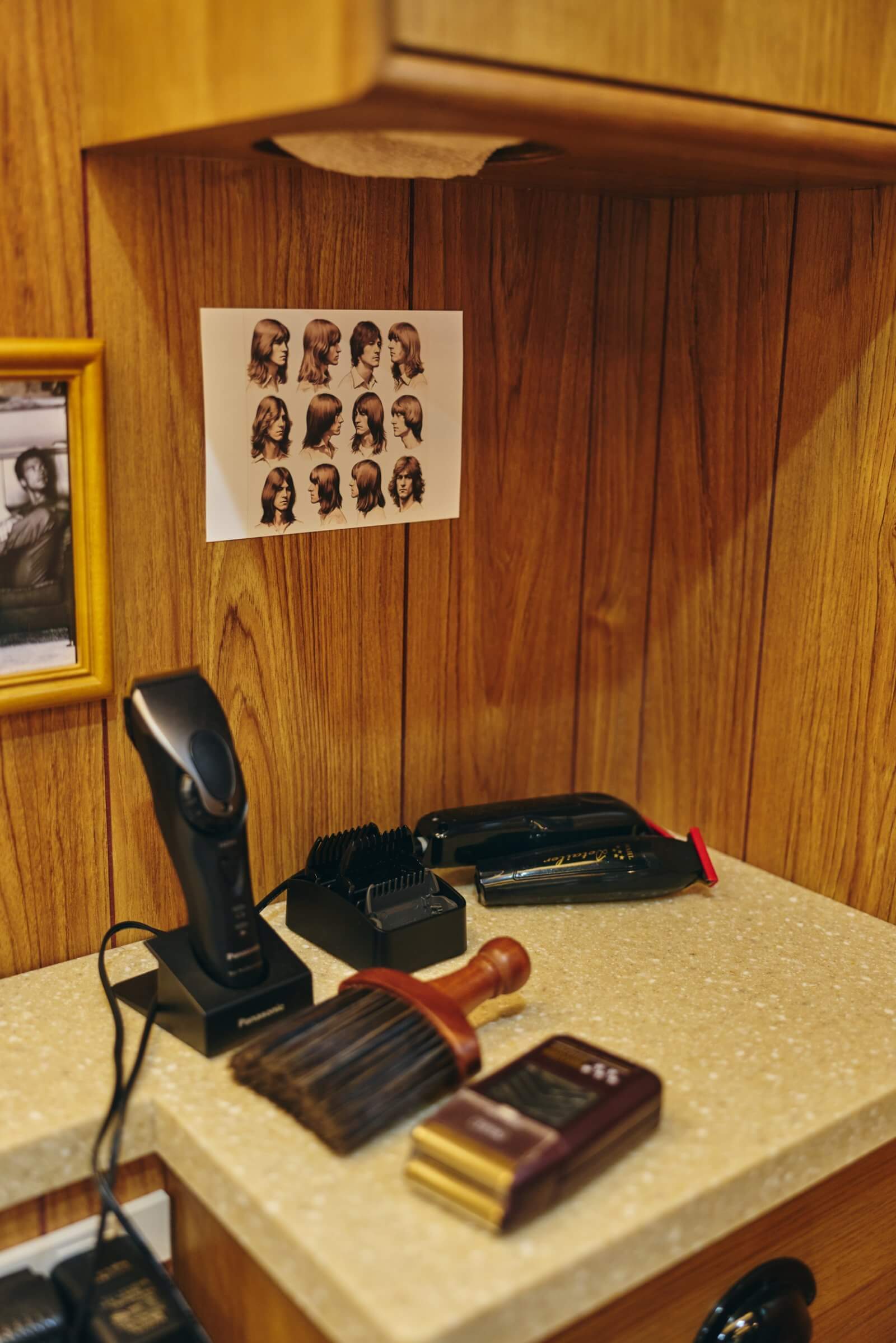 Tools such as scissors and combs recall the spirit of 1980s America.